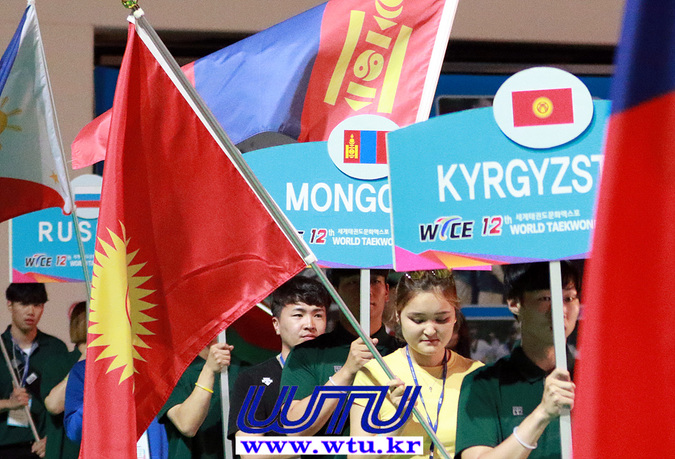 | ▲ © Each country flag bearer at the closing ceremony of the 12th World Taekwondo Culture Expo 제12회 세계태권도문화엑스포 폐막식에서 각 국가 기수들 모습 (WTU) |